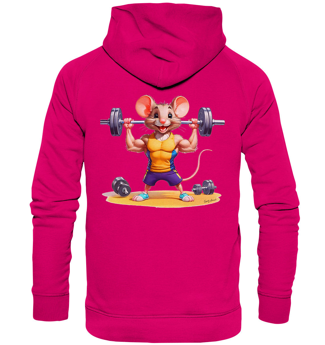 Bereit für ein sportliches Abenteuer mit einem Hauch von Humor? Unser Hoodie für Damen und Herren zeigt eine muskelbepackte Maus beim Fitness-Training! Mit diesem lustigen Design wirst du zum Blickfang im Fitnessstudio. Sei wie unsere Maus: Stark, energiegeladen und immer bereit für neue Herausforderungen! Mach dein Workout zum Spaß mit diesem einzigartigen Hoodie!