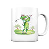 Vordergrund! Unser Kaffeebecher mit einem Golf spielenden Krokodil bringt den grünen Rasen auf den Frühstückstisch! Das knuffige Reptil schwingt den Schläger mit präziser Schnauze, während du deinen Morgenkaffee genießt. Mach dich bereit für einen „krass guten“ Start in den Tag!