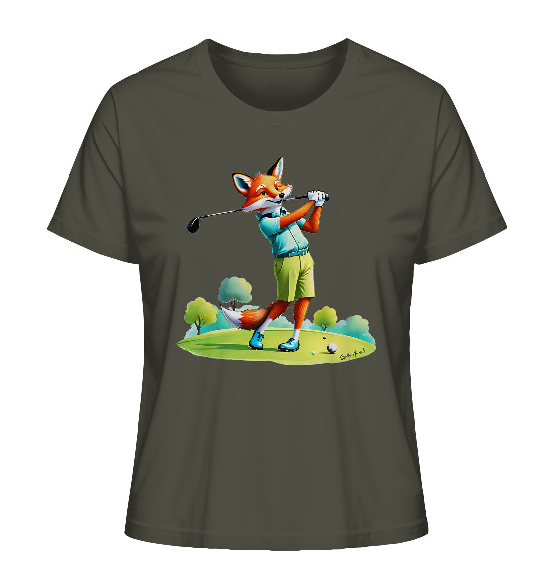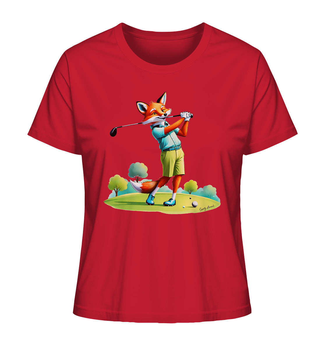 "Schlauer Fuchs auf dem Golfplatz: Bio-Baumwoll-T-Shirt mit einzigartigem Comic-Print" – Unser Damen-T-Shirt aus 100% Bio-Baumwolle ist ein echter Hingucker! Der listige Fuchs im Comic-Stil, der gerade einen Golfball abgeschlagen hat, vereint die Eleganz des Golfsports mit der Naturverbundenheit des Fuchses. Ein perfektes Geschenk für alle Naturliebhaber und Golf-Enthusiasten. #BioBaumwolle #DamenTshirt #FuchsMotiv #Golf #ComicPrint #Naturliebe #Geschenkidee #Nachhaltig #FairTrade #Tierliebe
