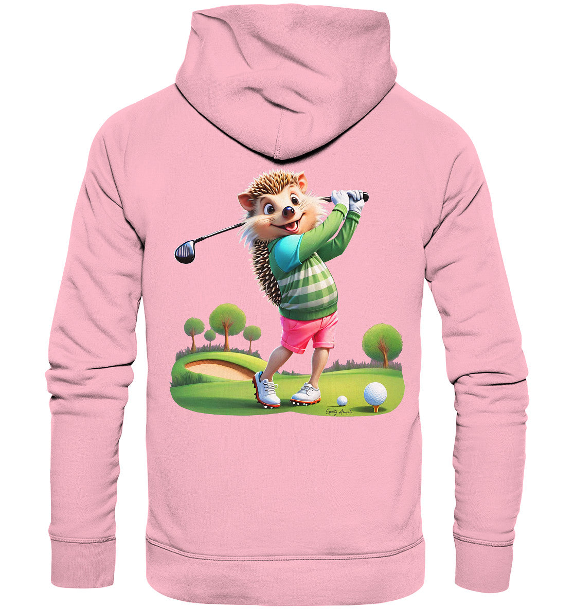Ein Igel auf dem Golfplatz? Mit unserem Hoodie wird dieser ungewöhnliche Anblick zur Realität! Der kleine Stachelträger zeigt, dass auch er den perfekten Schwung beherrscht. Der Hoodie aus Bio-Baumwolle ist so weich wie Igelfell und genauso einzigartig.