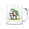 Entdecken Sie unseren Kaffeebecher mit einer verschmitzten Schildkröte im Comic-Stil, die sich als Fußballstar versucht! Diese quirlige Kröte zeigt, dass man auch mit einem gemütlichen Tempo große Ziele erreichen kann – genau wie beim Kaffeegenuss! Ein lustiges Geschenk für alle, die Fußball lieben und einen Sinn für Humor haben!