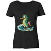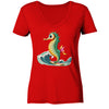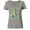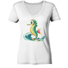 Entdecken Sie unser Damen-T-Shirt mit V-Ausschnitt und einem einzigartigen Design: Ein Seepferdchen, das surft! Das verspielte Motiv bringt die Eleganz und Anmut dieses faszinierenden Meerestieres zur Geltung. Ideal für Strandliebhaberinnen und alle, die einen individuellen Stil schätzen. Hergestellt aus hochwertiger Baumwolle bietet es maximalen Tragekomfort. Perfekt für entspannte Tage am Meer oder als Hingucker im Alltag.