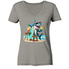 Komm ins Urlaubsfeeling mit unserem Damen T-Shirt mit V-Ausschnitt! Der Hai mit Surfbrett und Cocktail in der Flosse bringt Spaß und Strandvibes direkt zu dir. Perfekt für den Sommer oder einfach einen coolen Look. Zeig deinen unbeschwerten Style mit diesem witzigen Design!